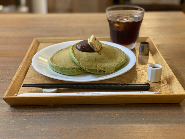 팬케이크인데 젓가락이 놓여있어요! 문화충격이죠. 교토라서 용납됩니다.