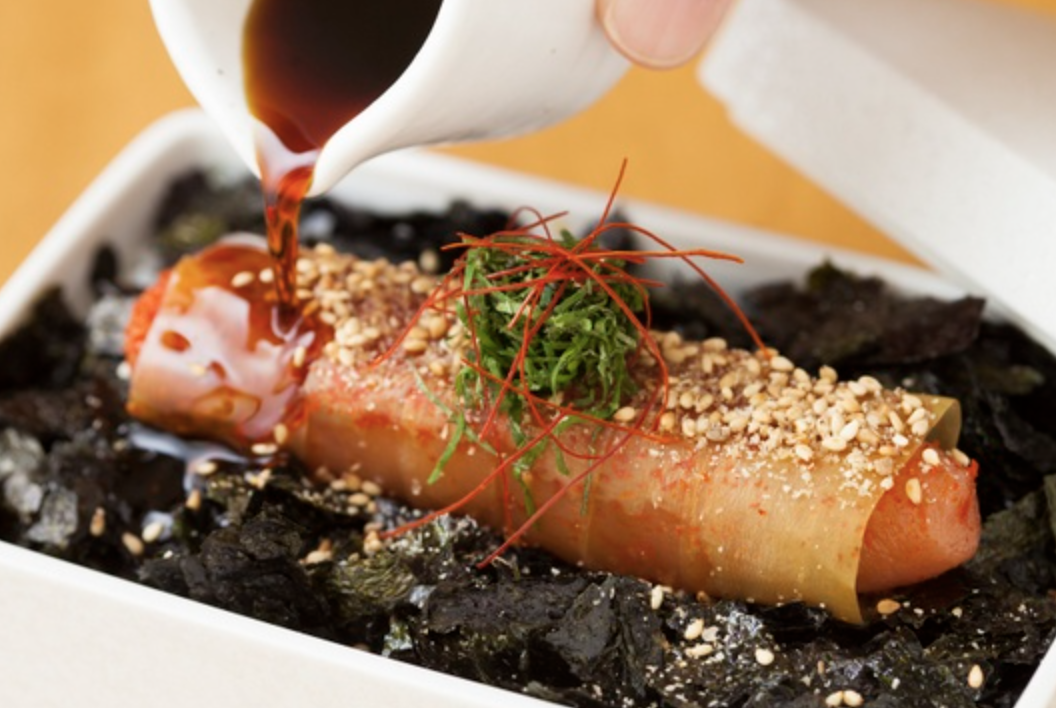 명란젓을 얇게 슬라이스 한 다시마로 감싸준 뒤